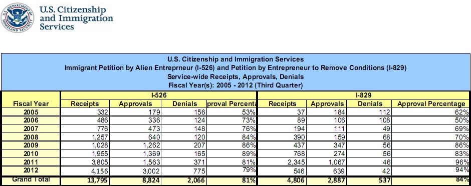 上圖: 2012年投資移民I-526和I-829的批準率分別是81%和84%。
