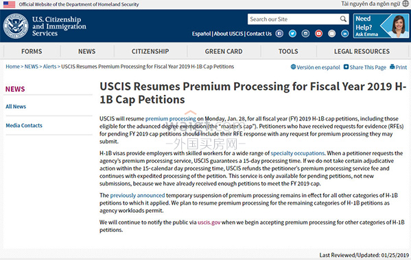1月28日起美國恢復2019財年H-1B申請加急服務