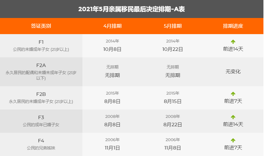 親屬移民緩慢前進,F1 公民未婚成年子女前進14天,F2B 永久居民未婚成年子女前進7天,F3 公民已婚成年子女前進14天,F4 公民兄弟姐妹前進7天。