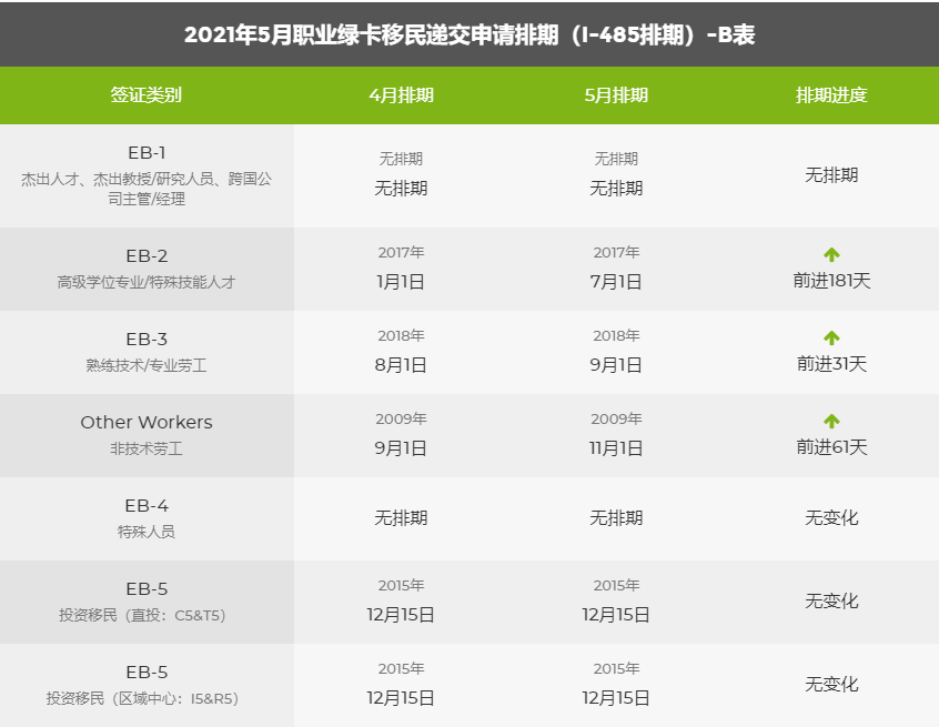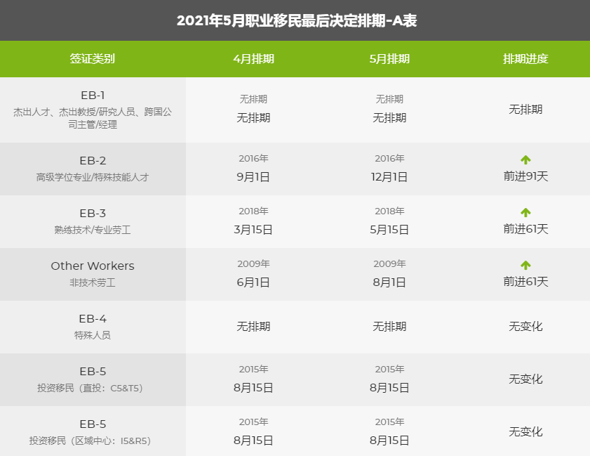 職業(yè)移民各種類型均有前進,EB1 沒有排期了,EB2 前進三個月,EB3 前進兩個月。