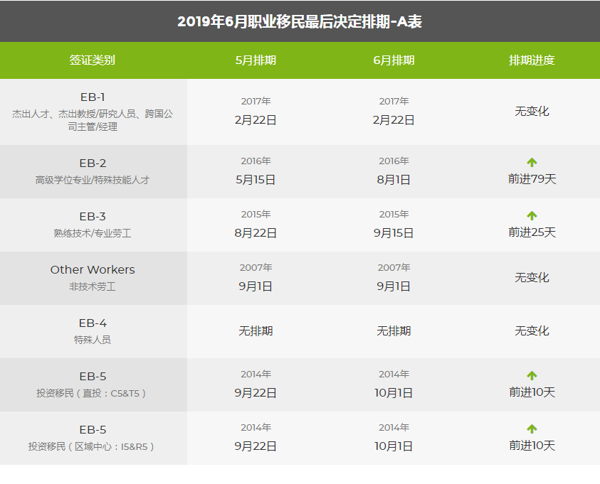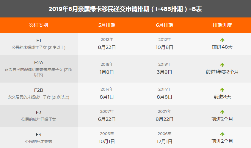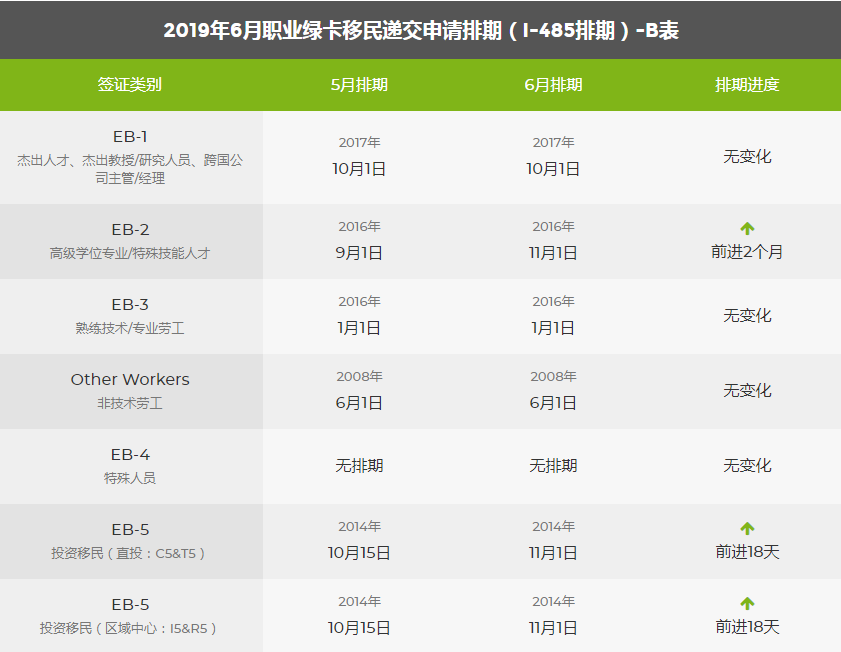 國務(wù)院公布的2019年6月綠卡移民排期公布,親屬移民前進幅度較大,職業(yè)移民 EB2 前進幅度較大有一個半月,EB3 穩(wěn)步前進。以下是幾個重點: