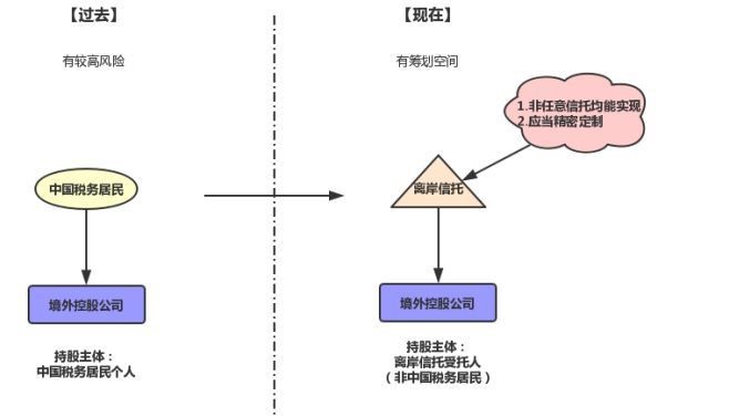(1)將資產(chǎn)由個(gè)人(中國(guó)稅務(wù)居民)持有轉(zhuǎn)為由離岸信托(非中國(guó)稅務(wù)居民)持有:若相關(guān)人士將由自己直接持有的股權(quán)裝入信托,此時(shí)離岸信托作為資產(chǎn)的所有權(quán)主體,境外收益的分紅主體完成了由中國(guó)稅務(wù)居民到非中國(guó)稅務(wù)居民的轉(zhuǎn)變,在現(xiàn)行稅法下,利潤(rùn)分配至信托項(xiàng)下境外控股公司暫不需要繳納中國(guó)個(gè)人所得稅。
