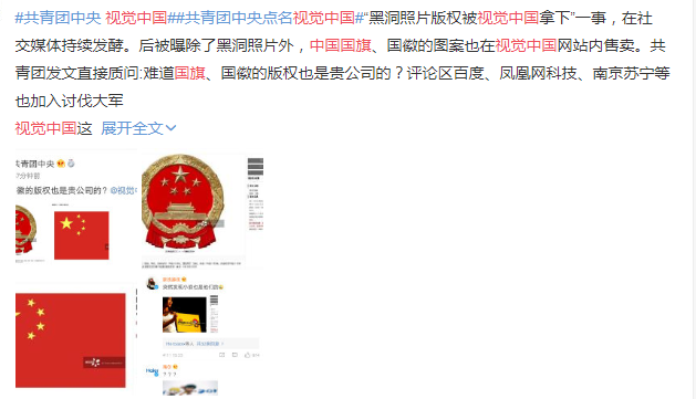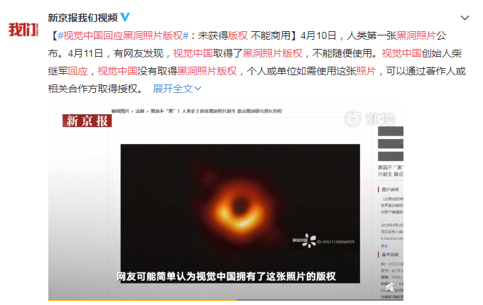 4月10日,人類第一張黑洞照片公布,但在4月11日就有人發(fā)現(xiàn)視覺(jué)中國(guó)取得黑洞照片的版權(quán),不能隨意使用。“黑洞照片”的圖源——歐洲南方天文臺(tái)(ESO)官網(wǎng),聲明該圖片支持共享和再創(chuàng)作等演繹,無(wú)需支付費(fèi)用。這還沒(méi)有結(jié)束,視覺(jué)中國(guó)竟然被共青團(tuán)中央點(diǎn)名,國(guó)旗、國(guó)徽的版權(quán)也是貴公司的?