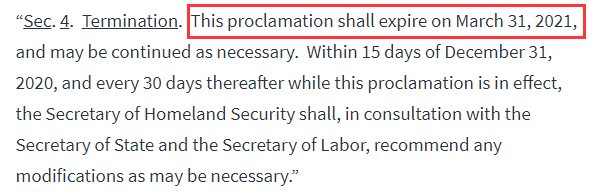 美國當地時間2020年12月31日,美國總統特朗普宣布將移民和工作簽證禁令延長3個月(具體解除時間以總統令為準),從而使得這一禁令將在拜登就任后繼續生效。特朗普表示,外國勞動力進入美國國內市場有損美國的根本利益,簽證禁令保護了美國本土工人。